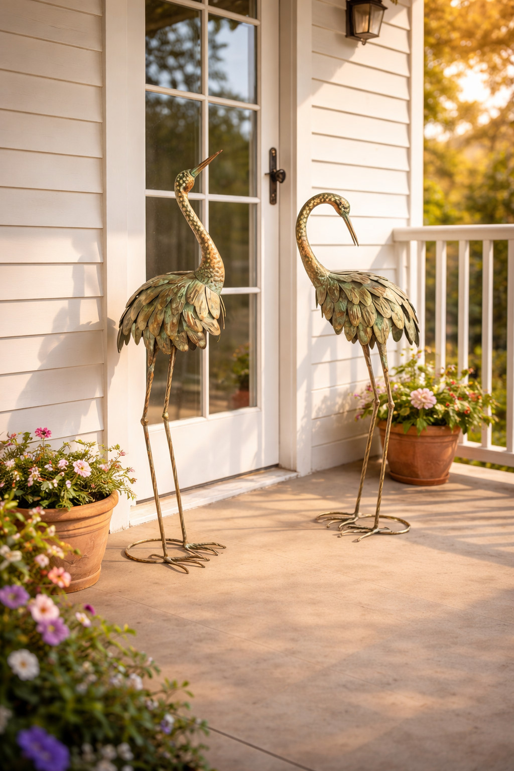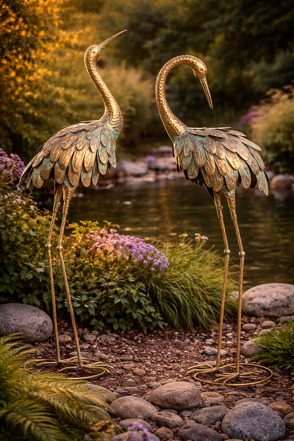 L’un incline délicatement son cou tandis que l’autre se tient droit avec élégance. Leur finition dorée apporte une touche lumineuse et sophistiquée à votre jardin ou terrasse 💛.