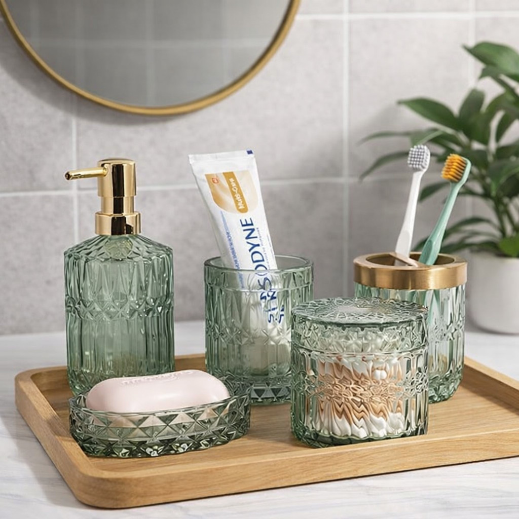 Lot de 5 accessoires verre vert avec distributeur de lotion