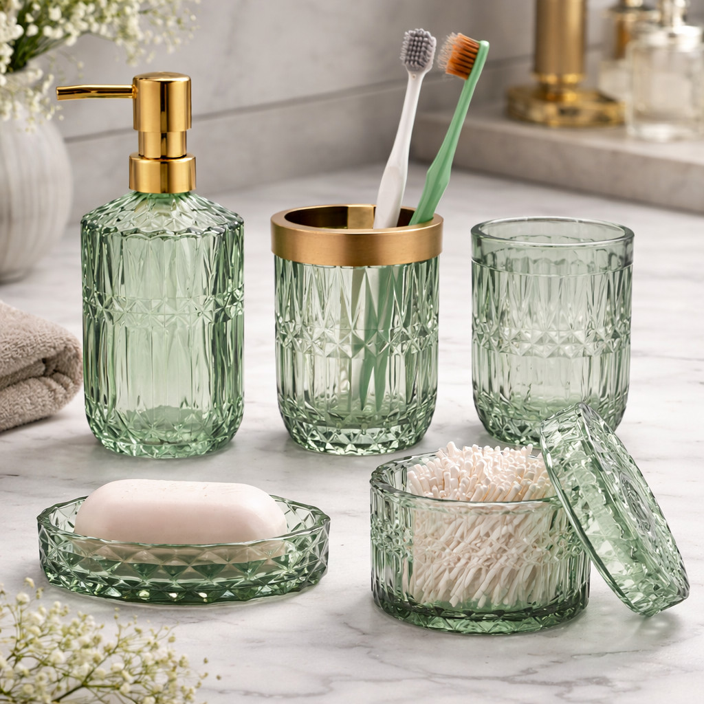 Apportez une touche d’élégance à votre salle de bain avec cet ensemble en verre vert au style rétro sophistiqué. Sa texture effet diamant offre un rendu visuel unique tout en assurant une bonne prise en main 💎. Un choix idéal pour sublimer votre espace avec caractère et harmonie.