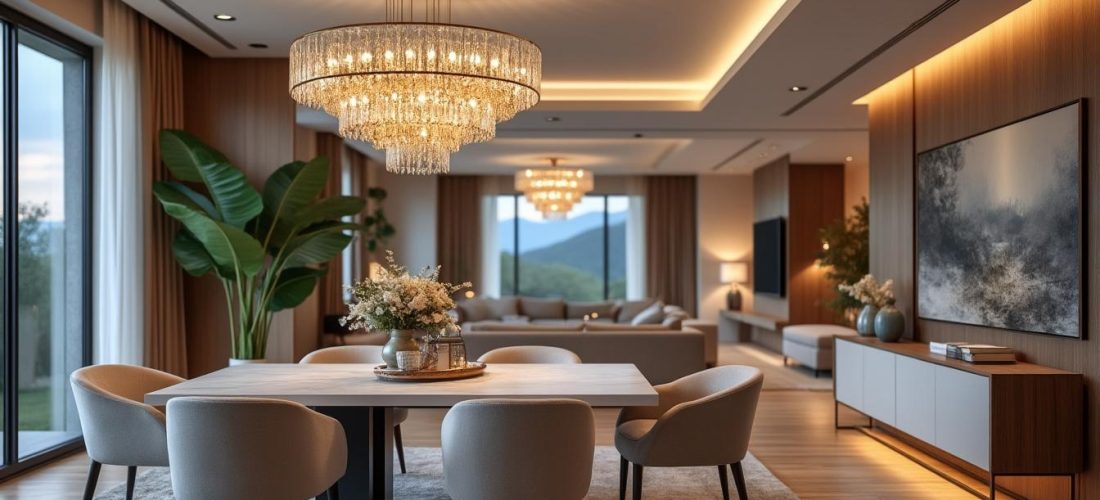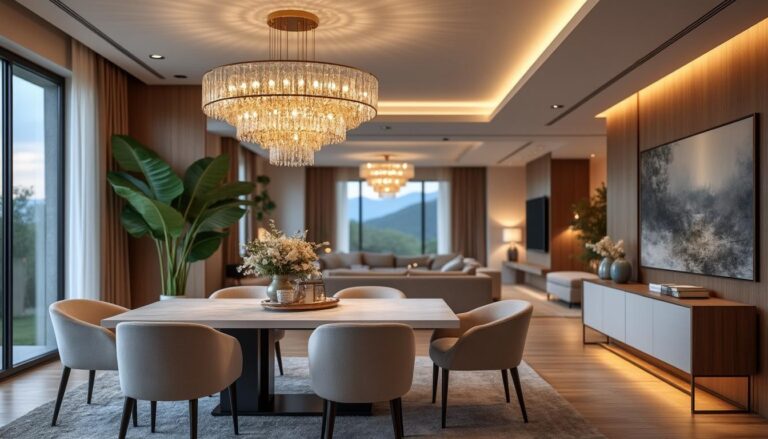 La définition d’un espace repas dans le séjour dépend autant du mobilier que de l’éclairage. Une suspension ou un lustre majestueux structure visuellement l’espace et influence l’ambiance.