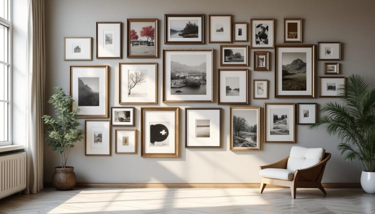 Pour réussir la composition, jouer sur formats, alignements et contrastes permet d’équilibrer mouvement et repos visuel. L’exemple d’un salon parisien illustre une composition mixte associant tableaux, photographies et miroirs placés en quinconce.